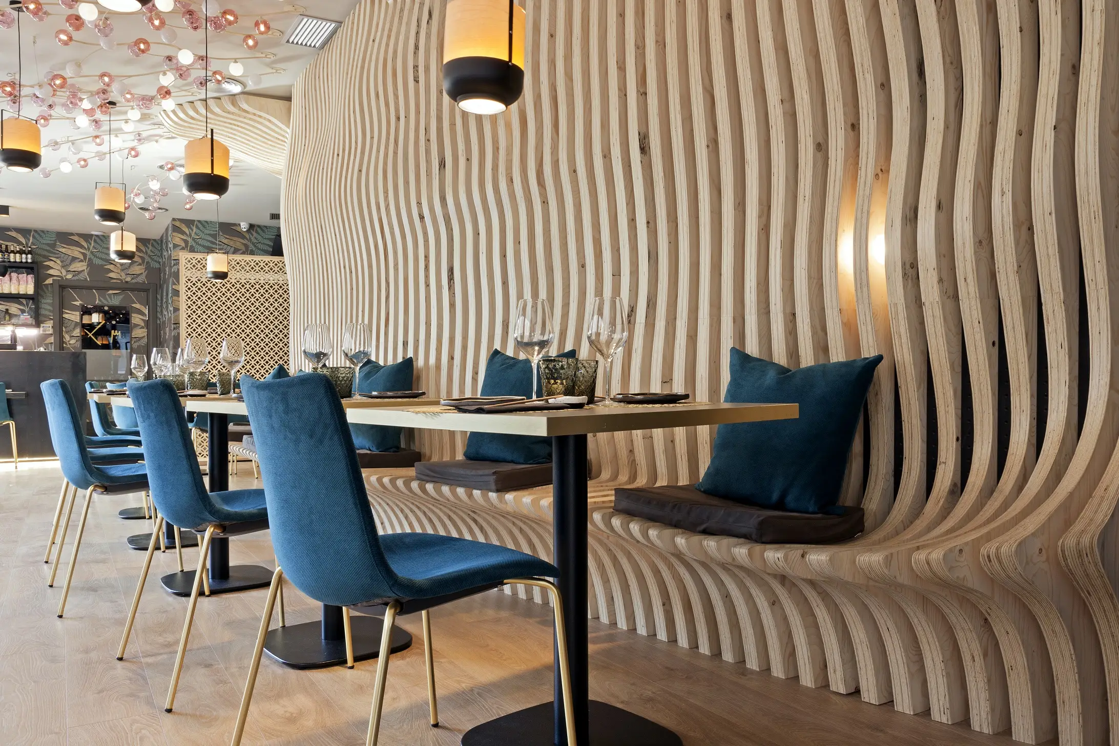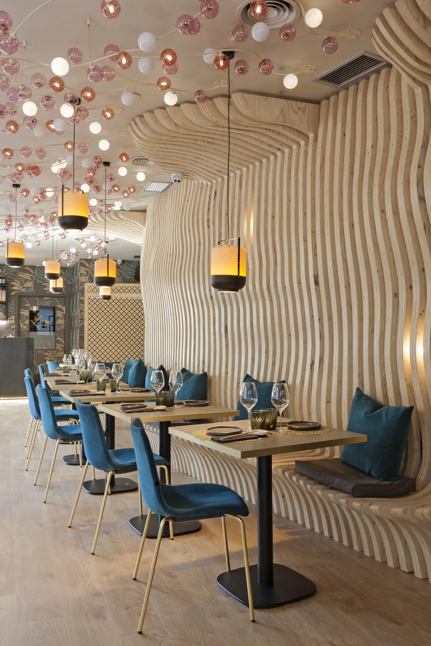 Los propietarios del restaurante japonés nos encargaron el proyecto de su nuevo local en Granollers, Kodama. El concepto se inspira en los kodamas, espíritus que habitan en los árboles según la tradición japonesa. También recuperamos el Hanami, la contemplación de los cerezos en flor.