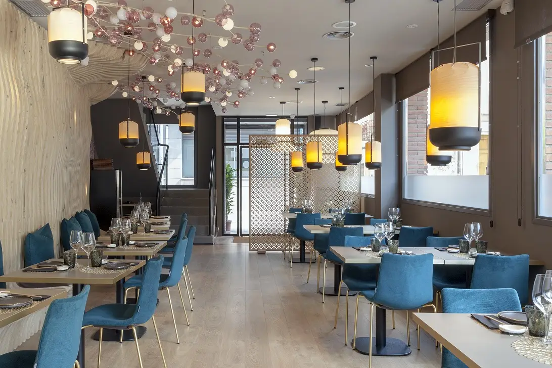 Decidimos trasladar esa experiencia poética a occidente en el diseño del espacio. El local se decoró con cerezos en flor y pequeños kodamas iluminados que aportan magia y misterio.